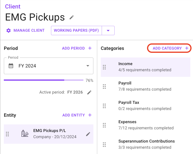 To start adding categories and requirements to an entity, first select the entity you wish to work on and then click the “Add Catgeory” button on the Client page.