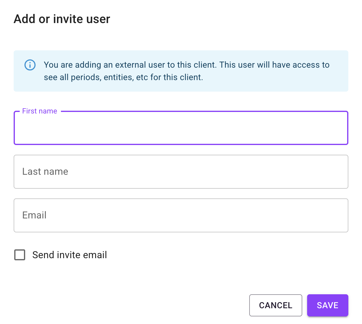 Complete the fields on the “Add or invite user” popup. By default the invite is not sent immediately unless you check the “Send invite email” checkbox. This option is there in case you still need to do some more setup for the client, or you want to send multiple invites at once.