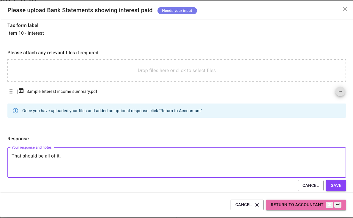 If needed, notes can be added in the “Response” text field. When the client has finished their response they should click the “Return to Accountant” button. Clicking “Cancel” closes the window without changing the status. If a client wants to they can save their response, come back and add more text later, and then “Return to Accountant”.