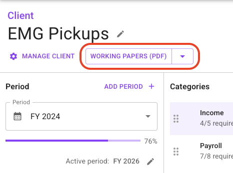 The PDF Working Papers will include every category and requirement, along with every attachment uploaded by the client.